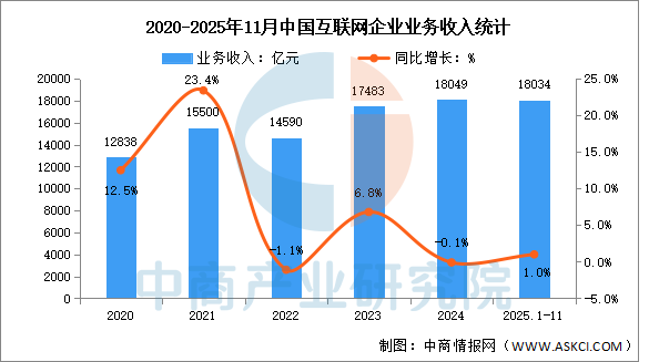 中商情报网讯:互联网业务收入稳定增长。1—11月份,我国规模以上互联网和相关服务企业完成互联网业务收入18034亿元,同比增长1%,增速较1—10月份回落0.1个百分点。