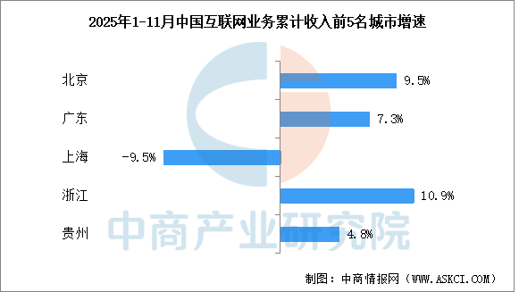 近三成地区互联网业务收入实现正增长。1—11月份,互联网业务累计收入居前5名的北京(增长9.5%)、广东(增长7.3%)、上海(下降9.5%)、浙江(增长10.9%)和贵州(增长4.8%)共完成业务收入15239亿元,同比增长4%,占全国(扣除跨地区企业)互联网业务收入的84.5%。全国互联网业务收入实现正增长的省(自治区、直辖市)有8个,其中内蒙古、河北、浙江、陕西增速超10%。
