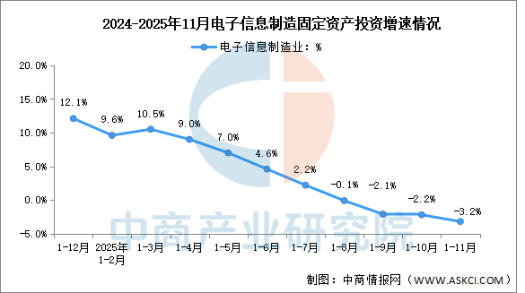 1—11月,电子信息制造业固定资产投资同比下降3.2%,较1—10月回落1个百分点,比同期工业投资增速低7.2个百分点。