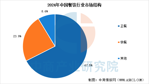 中国餐饮市场按提供的服务内容及产品特点可分为三个品类,即正餐、快餐及其他。正餐指提供以午餐、晚餐为主的各种中西餐,并由服务员提供全面的餐桌服务。快餐指快捷、便利的餐饮活动,往往提供有限的餐桌服务。其他包含饮料服务、流动餐饮等。中商产业研究院发布的《2025-2030年中国餐饮行业市场调查及研究预测报告》显示,2024年中国餐饮市场中,正餐和快餐分别占比,67.5%和23.9%。