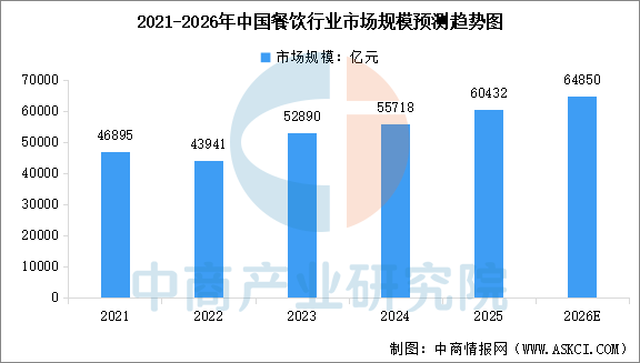 中商情报网讯:餐饮业指通过实时制作加工、商业销售和服务性劳动等向消费者提供食品和消费场所及设施的服务。中国是全球第二大的餐饮市场,中商产业研究院发布的《2025-2030年中国餐饮行业市场调查及研究预测报告》显示,2024年中国餐饮行业市场规模达到55718亿元,较上年增长5.3%。中商产业研究院分析师预测,2026年中国餐饮行业市场规模将达到64850亿元。