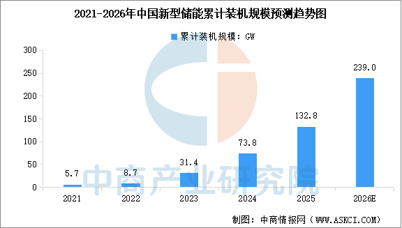 中国是全球最大的储能应用市场,产业增长动力强劲。中商产业研究院发布的《2025-2030年中国新型储能市场深度分析及发展前景研究预测报告》显示,截至2024年底,中国新型储能累计装机规模达73.8GW,较2023年增长135%。截至2025年9月底,中国新型储能累计装机规模超过100GW。中商产业研究院分析师预测,2026年中国新型储能累计装机规模将达到239GW。