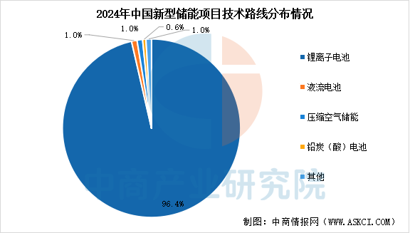 中国新型储能技术路线呈现以锂离子电池为主导、多技术并行发展的格局,其中锂离子电池占比96.4%,成为绝对主流;其他技术如压缩空气储能、液流电池储能、钠离子电池储能等占比相对较低,但发展迅速,例如压缩空气储能和液流电池在长时储能领域逐步应用,钠离子电池和固态电池等新兴技术处于示范阶段并加速突破。