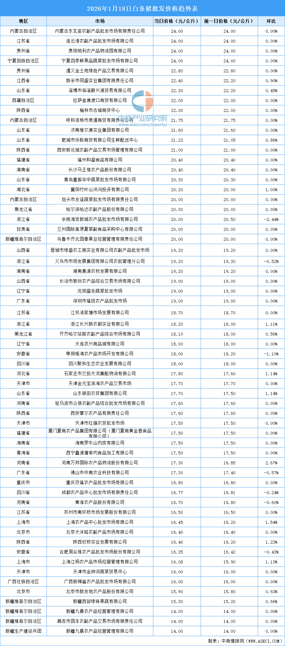 中商情报网讯:最新数据显示:1月18日全国白条猪平均价格为18.76元/公斤。其中,白条猪价格最高的市场是内蒙古东瓦窑农副产品批发市场有限责任公司、连云港农副产品批发市场有限公司、贵阳地利农产品物流园有限公司、宁夏四季鲜果品蔬菜批发市场有限公司,当日价格均为24.00元/公斤。白条猪价格最低的是昌吉市园丰农副产品交易市场有限责任公司和新疆九鼎农产品经营管理有限公司,当日价格均为14.00元/公斤。