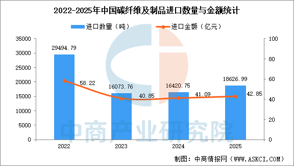 根据海关数据,2025年我国碳纤维及制品(包括碳纤维、碳纤维织物、碳纤维预浸料及其他碳纤维制品)进口量1.86万吨、进口额42.85亿元,出口量1.69万吨,出口额25.00亿元。2022至2025年,行业总体呈现进口量下降,出口量持续增加的趋势,贸易逆差大幅收窄,国产化替代成效显著,这主要得益于我国在风电、体育用品等民用领域的产能规模优势。