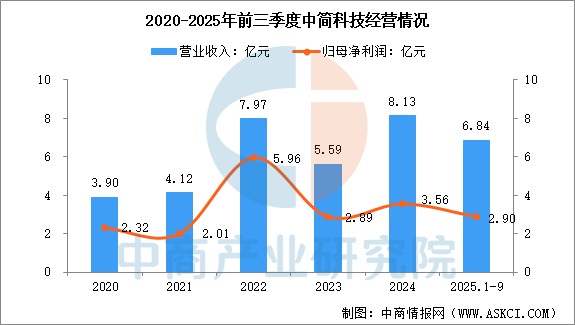 2025年前三季度,中简科技营业收入为6.84亿元,同比增长28.46%,归母净利润为2.90亿元,同比增长25.45%。2025年上半年主营产品包括碳纤维、碳纤维织物,营收分别占整体的74.53%、25.47%。
