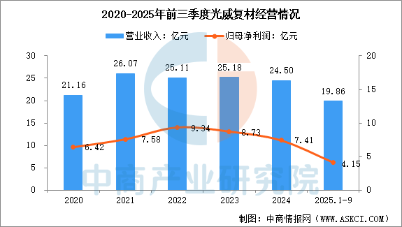 2025年前三季度,光威复材营业收入为19.86亿元,同比增长4.40%,归母净利润为4.15亿元,同比下降32.55%。2025年上半年主营产品包括碳纤维及织物、碳梁、预浸料、制品及其他,营收分别占整体的52.93%、30.73%、9.27%、7.07%。