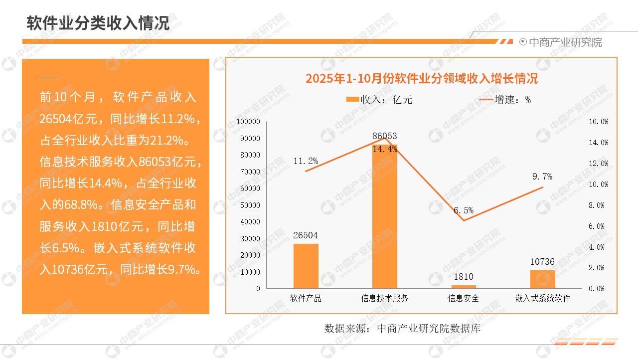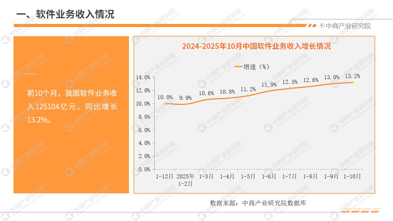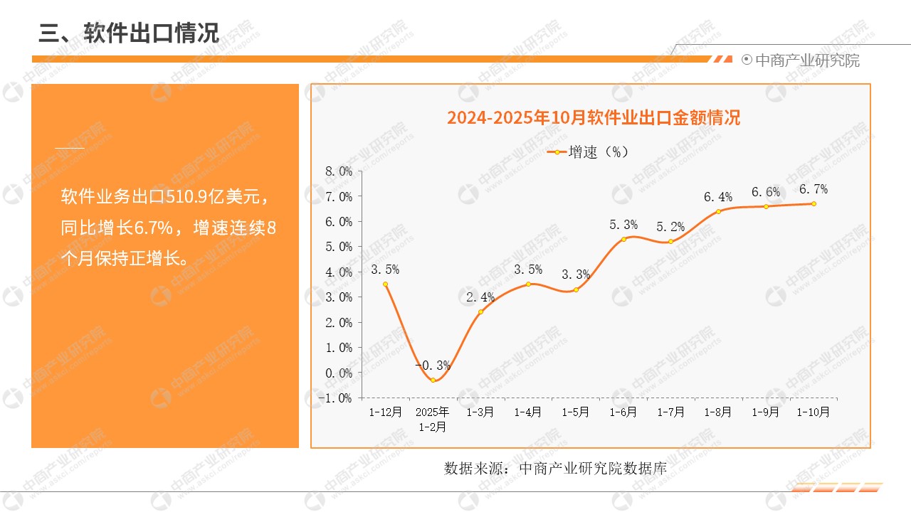 中商情报网讯:2025年前10个月,我国软件和信息技术服务业运行态势良好,软件业务收入稳健增长,利润总额增势放缓,软件业务出口保持正增长。