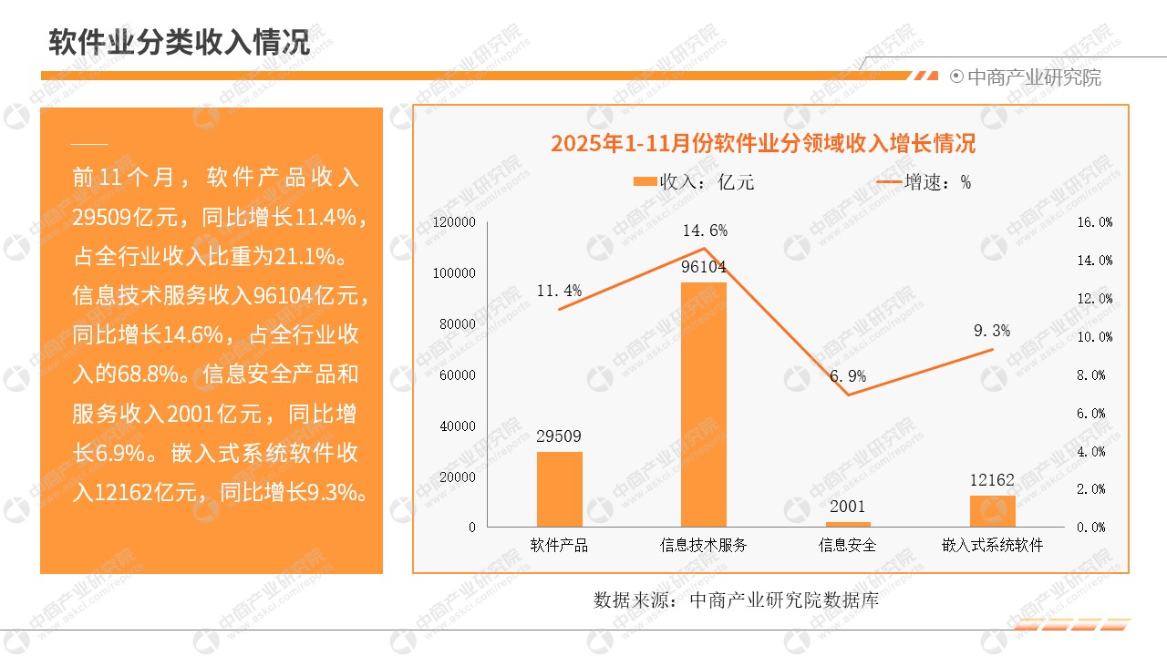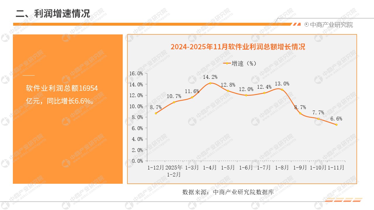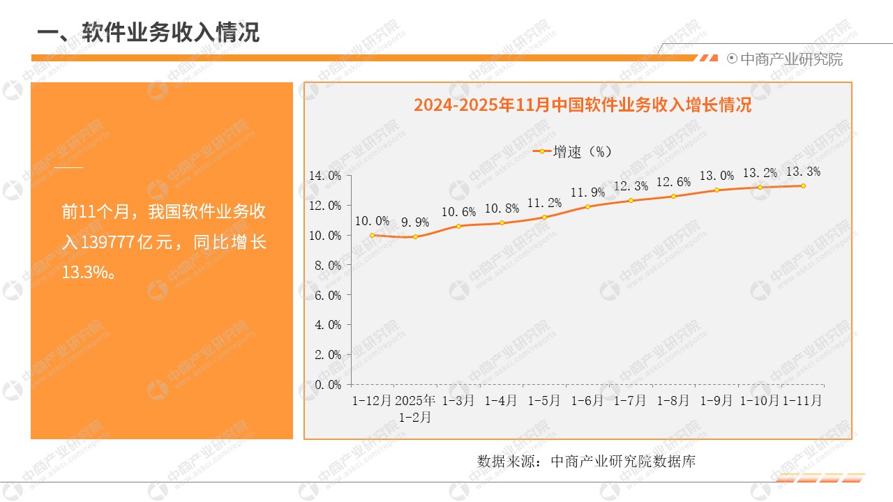 中商情报网讯:2025年前11个月,我国软件和信息技术服务业运行态势良好,软件业务收入稳健增长,利润总额增势放缓,软件业务出口保持正增长。