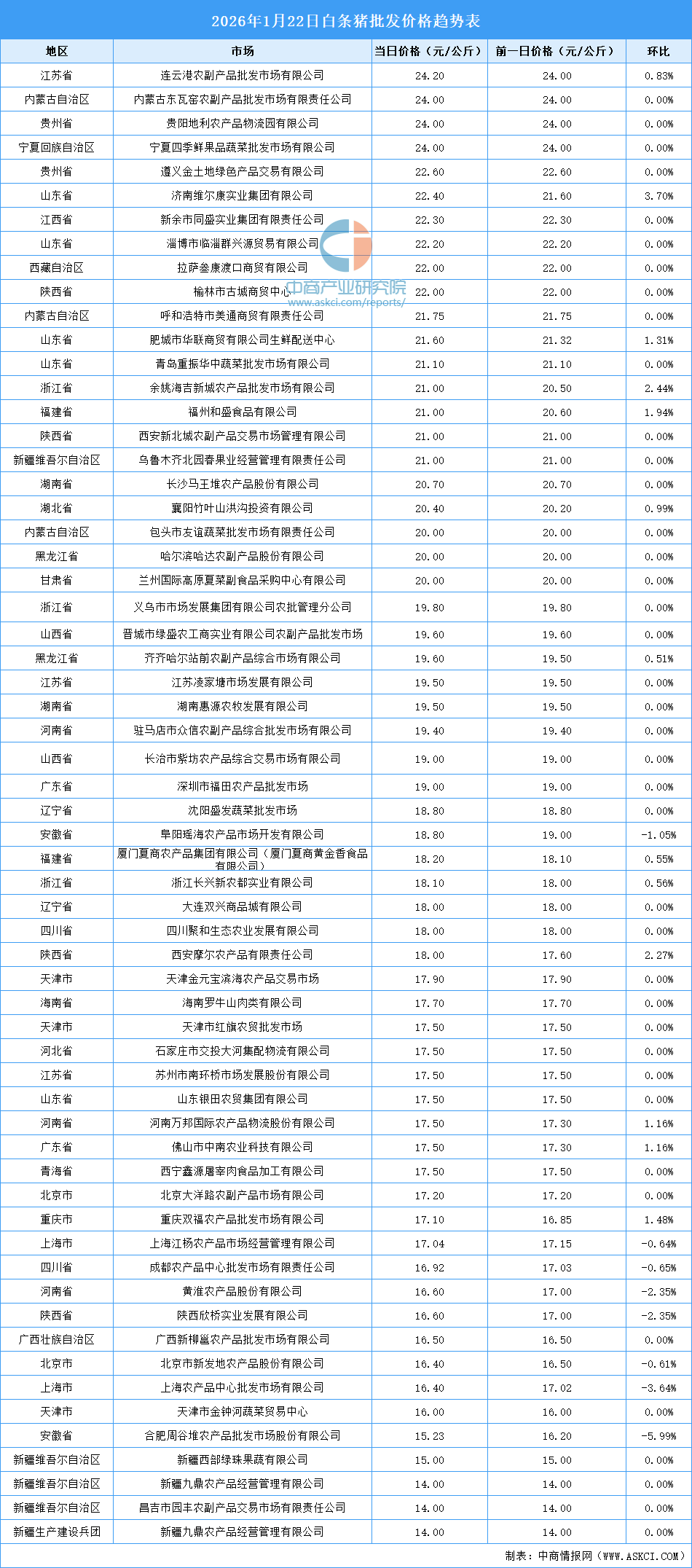 中商情报网讯:最新数据显示:1月22日全国白条猪平均价格为19.01元/公斤。其中,白条猪价格最高的市场是连云港农副产品批发市场有限公司、内蒙古东瓦窑农副产品批发市场有限责任公司、贵阳地利农产品物流园有限公司、宁夏四季鲜果品蔬菜批发市场有限公司,当日价格均为24.00元/公斤。白条猪价格最低的是昌吉市园丰农副产品交易市场有限责任公司和新疆九鼎农产品经营管理有限公司,当日价格均为14.00元/公斤。