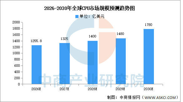 中商产业研究院发布的《2025-2030年中国CPU市场前景预测深度研究报告》显示,2026年全球CPU处理器市场规模将达到1255.8亿美元,市场空间广阔。中商产业研究院分析,从2026到2030年,全球CPU市场规模将呈现稳健扩张,初期增长由AI服务器建设直接拉动,随后AIPC普及与边缘计算扩张为市场注入持续动力,加之芯片制程迭代刺激的换机需求,共同推动市场从以“量增”为主转向以“质变”和“价升”为主导的高价值增长阶段。