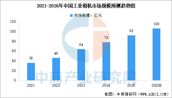 中商情报网讯:在政策支持和市场需求的双重驱动下,中国工业相机市场正处在快速发展阶段。中商产业研究院发布的《2025-2030年中国工业相机行业市场前景预测及未来发展趋势研究简报》显示,2024年中国工业相机市场规模达到78亿元,较上年增长21.9%,2025年市场规模约为92亿元。中商产业研究院分析师预测,2026年中国工业相机市场规模将达到106亿元。