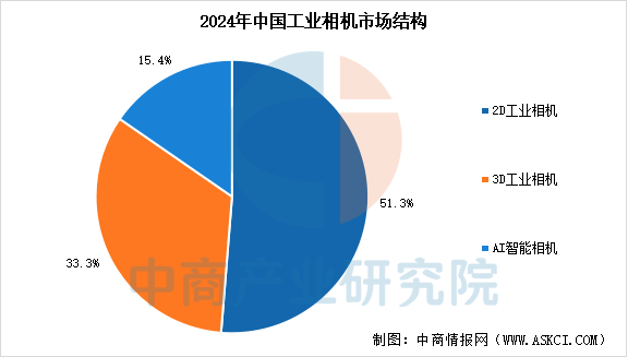 中商产业研究院发布的《2025-2030年中国工业相机行业市场前景预测及未来发展趋势研究简报》显示,2024年中国2D工业相机市场规模为40亿元,占比51.3%,3D工业相机市场规模为26亿元,占比33.3%,AI智能相机市场规模为12亿元,占比15.4%。