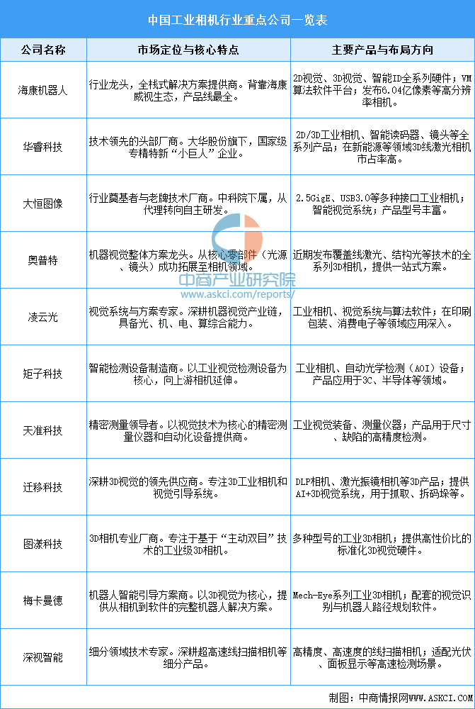 中国工业相机领域的重点公司包括海康机器人、华睿科技、大恒图像、奥普特、凌云光、矩子科技、天准科技、迁移科技、图漾科技、梅卡曼德以及深视智能等。