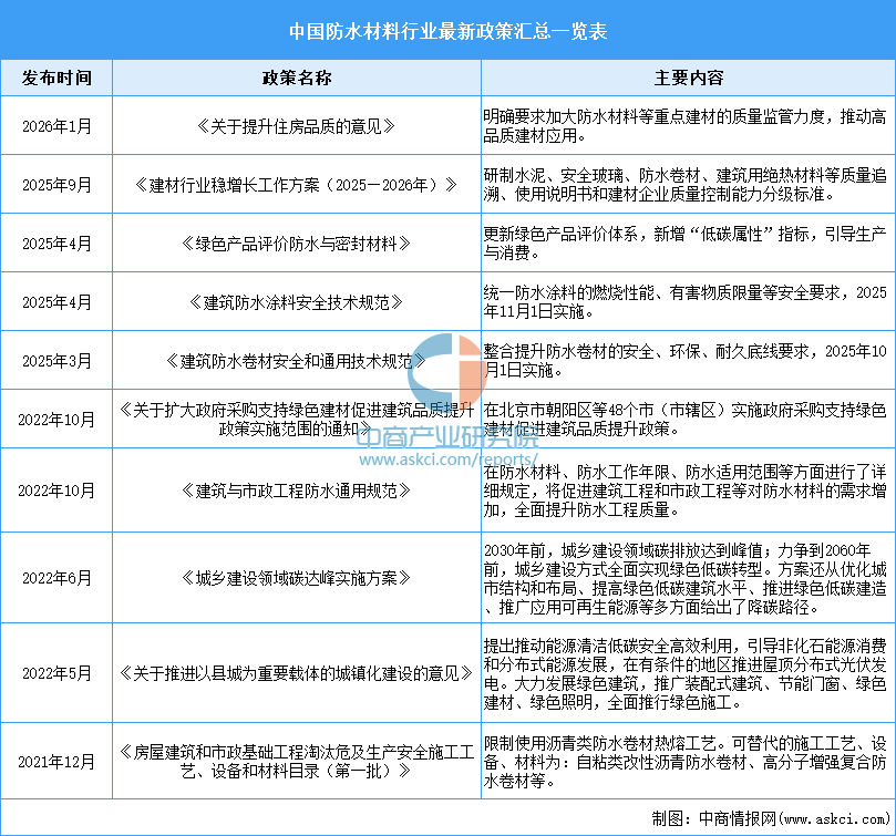 更多资料请参考中商产业研究院发布的《2025-2030年中国防水材料行业深度研究及发展前景投资预测分析报告》,同时中商产业研究院还提供产业大数据、产业情报、行业研究报告、行业白皮书、行业地位证明、可行性研究报告、产业规划、产业链招商图谱、产业招商指引、产业链招商考察&推介会、“十五五”规划等咨询服务。