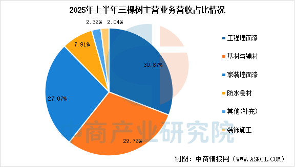 三棵树涂料股份有限公司主营业务为建筑涂料(墙面涂料)、防水材料、地坪材料、保温材料及保温一体化板、木器涂料、胶粘剂、基辅材、工业涂料等产品的研发、生产和销售。2025年前三季度,三棵树实现营业总收入93.92亿元,同比增长2.69%,归母净利润7.44亿元,同比增长81.22%。2025年上半年,公司防水卷材收入4.603亿元,占比7.91%。