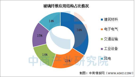 我国的玻璃纤维主要应用于建筑材料领域,占比达34%。其次分别为电子电气、交通运输、工业设备、风电等领域,占比分别为21%、16%、15%、14%。