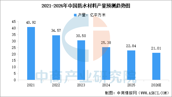 受房地产下行和基建投资放缓影响,近年来中国防水材料产量呈现“先增后降”的趋势。中商产业研究院发布的《2025-2030年中国防水材料行业深度研究及发展前景投资预测分析报告》显示,2024年中国防水材料产量为25.38亿平方米,同比下降16.8%,2025年产量约22.84亿平方米。中商产业研究院分析师预测,2026年中国防水材料产量将进一步降至21.01亿平方米。