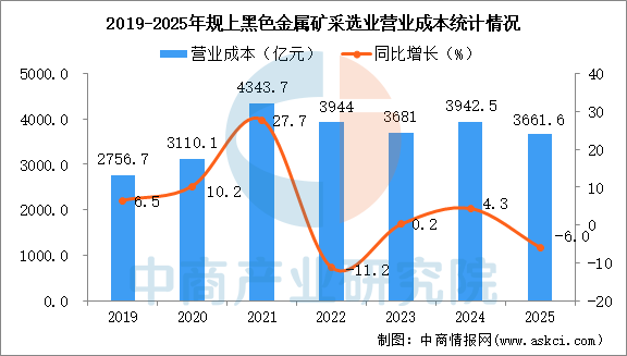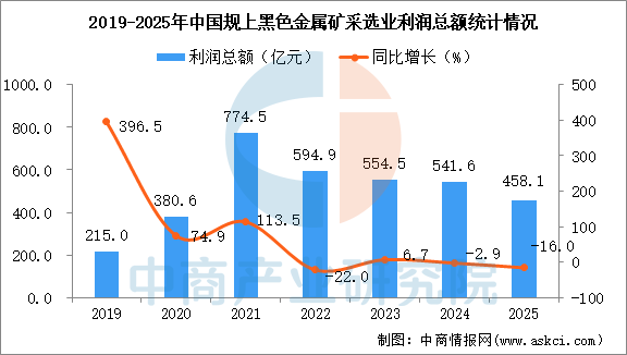 2025年1-12月,全国规模以上黑色金属矿采选业企业营业收入4572.9亿元,同比下降7.0%;营业成本3661.6亿元,同比下降6.0%;利润总额458.1亿元,同比下降16.0%。