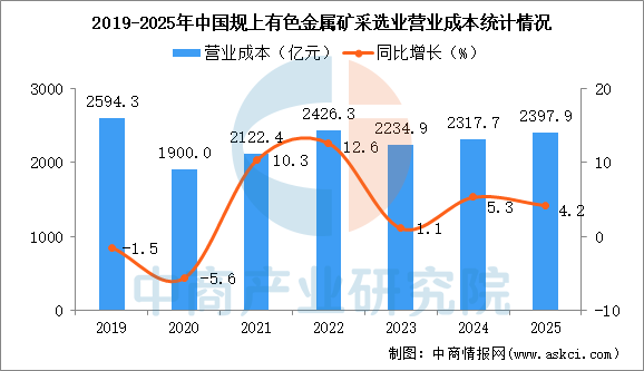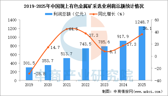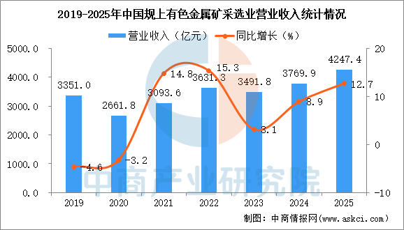 2025年1-12月,全国规模以上有色金属矿采选业营业收入4247.4亿元,同比增长12.7%;营业成本2397.9亿元,同比增长4.2%;利润总额1248.7亿元,同比增长36.1%。
