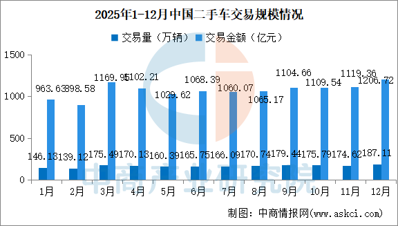 中商情报网讯:2025年12月,全国二手车市场交易量187.11万辆,环比增长7.15%,同比下降1.53%,交易金额为1206.72亿元。市场受多重因素影响:一方面,新车年终大促分流需求、消费者购车决策推迟,市场未有大幅突破;另一方面,“两新”政策延续信号使部分置换需求递延至2026年,不过多数车商通过降价促销、优化金融等方式推动销量增长支撑起月末翘尾。