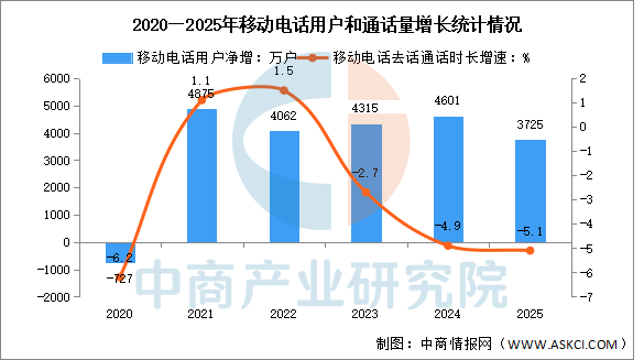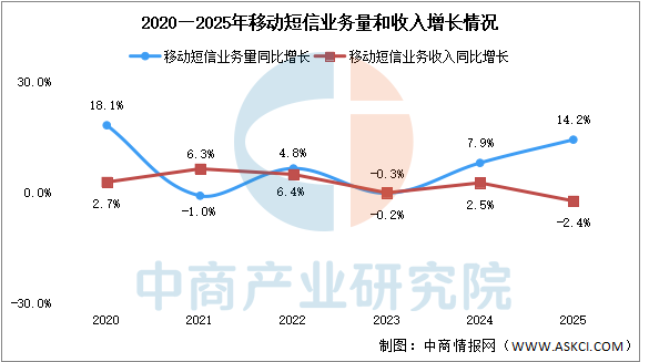 2025年,全国移动短信业务量23020亿条,比上年增长14.2%,移动短信业务收入比上年下降2.4%。全国移动电话去话通话时长2.02万亿分钟,比上年下降5.1%。
