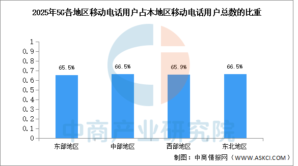 2025年,东、中、西部和东北地区5G移动电话用户占本地区移动电话用户总数的比重分别为65.5%、66.5%、65.9%、66.5%,占比较上年分别提高8.9个、9.3个、9.6个和10.3个百分点。2025年,京津冀、长三角地区5G移动电话用户占本地区移动电话用户总数的比重分别为64.3%、64.8%,占比较上年分别提高8.9个和8.8个百分点。
