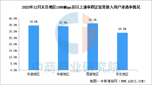 截至2025年底,东、中、西部和东北地区1000Mbps及以上接入速率的用户占本地区固定互联网宽带接入用户数的比重分别为34.6%、33.9%、36.1%和29%,占比较上年分别提高3.4个、2.7个、4.4个和5.4个百分点。京津冀、长三角地区1000Mbps及以上接入速率的用户占本地区固定互联网宽带接入用户数的比重分别为36.8%、33%,占比较上年分别提高4.3个和2.5个百分点。