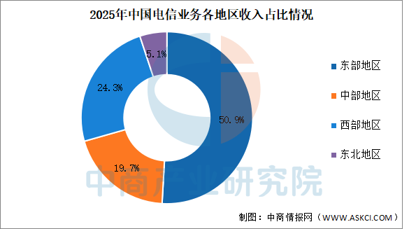 2025年,东、中、西部和东北地区的电信业务收入在全国的占比分别为50.9%、19.7%、24.3%和5.1%。京津冀地区、长三角地区电信业务收入占全国比重为9.1%和23.2%。