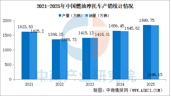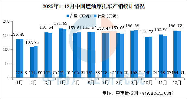 中商情报网讯:2025年12月,全行业完成燃油摩托车产销166.72万辆和164.71万辆,环比增长9.65%和11.94%,同比增长8.07%和10.3%;2025年1-12月,全行业完成燃油摩托车产销1849.75万辆和1846.15万辆,同比增长11.65%和12.16%;