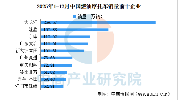 2025年1-12月,燃油摩托车销量前十名企业(集团)为大长江、隆鑫、宗申、广东大冶、新大洲本田、广州豪进、重庆银翔、洛阳北方、五羊-本田、江门市珠峰,分别销售268.67万辆、157.83万辆、113.92万辆、110.91万辆、100.31万辆、73.66万辆、72.91万辆、61.02万辆、59.48万辆和52.91万辆。