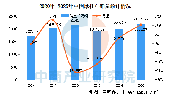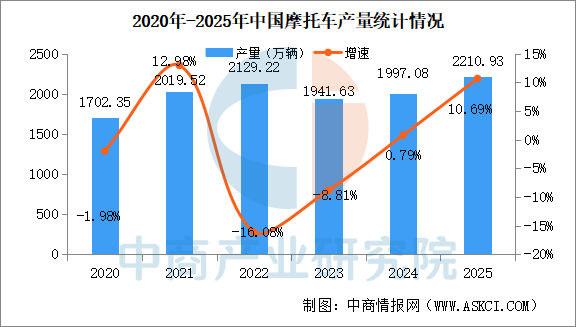 1-12月,共产销摩托车2210.93万辆和2196.77万辆,产销量同比增长10.69%和10.25%;摩托车国内销860.2万辆,同比下降3.45%,燃油摩托车国内销售514.49万辆,同比下降6.18%。其中,二轮摩托车产销1931.05万辆和1916.44万辆,产销量同比增长10.83%和10.32%;大排量休闲娱乐摩托车(排量250cc以上,不含250cc)产销95.37万辆和95.23万辆,同比增长23.3%和25.87%。三轮摩托车产销279.87万辆和280.33万辆,同比增长9.73%和9.75%。