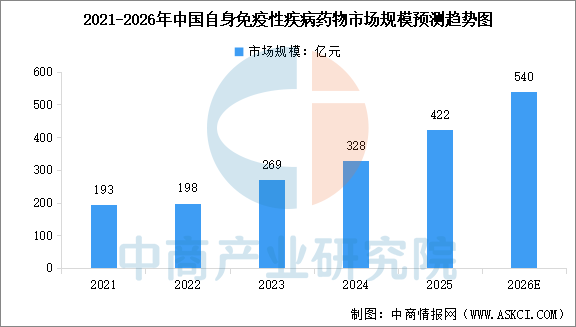 在各种自身免疫性疾病患病率不断上升、大量临床需求未得到满足及研发取得重大进展等因素的推动下,中国自身免疫性疾病药物市场近年来呈现快速增长态势。中商产业研究院发布的《2025-2030年中国自身免疫性疾病药物分析及发展趋势研究预测报告》显示,2019年到2024年中国自身免疫性疾病药物市场规模从162亿元增长至328亿元,复合年增长率为15.1%。中商产业研究院分析师预测,2026年中国自身免疫疾病药物市场规模将达540亿元。