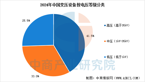 按额定电压等级划分,变压设备可分为低压(低于1kV)、中压(1kV-35kV)和高压(高于35kV)三类。高压变压设备承担电网中的核心输配电功能,占比41.5%。中压变压设备是新能源和数据中心应用的关键配电基础设施,占比33%;低压变压设备广泛应用于消费电子行业和工业控制系统,占比25.5%。
