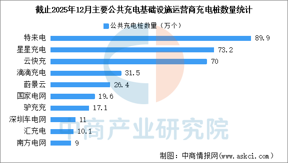 截止到2025年12月,全国充电运营企业所运营充电桩数量TOP10,分别为:特来电运营89.9万个、星星充电运营73.2万个、云快充运营70.0万个、滴滴充电运营31.5万个、蔚景云运营26.4万个、国家电网运营19.6万个、驴充充运营17.1万个、深圳车电网运营11.0万个、汇充电运营10.1万个、南方电网运营9.0万个。