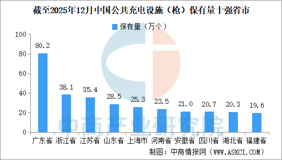 截至2025年12月底,广东、浙江、江苏、山东、上海、河南、安徽、四川、湖北、福建TOP10地区建设的公共充电设施占比达65.7%。其中,广东公共充电设施(枪)保有量80.2万个。