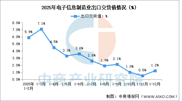2025年,规模以上电子信息制造业累计实现出口交货值同比持平。12月份,规模以上电子信息制造业实现出口交货值同比增长1.2%。