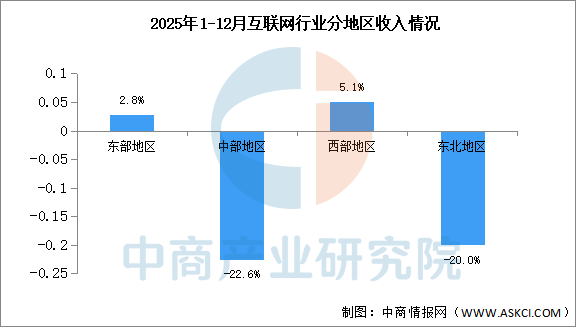 中商情报网讯:2025年,东部地区、中部地区、西部地区、东北地区互联网业务收入分别同比增长2.8%、-22.6%、5.1%、-20%。东部地区互联网业务收入占全国的88.9%。京津冀地区互联网业务收入同比增长8.7%,长三角地区互联网业务收入同比下降3%,两个地区互联网业务收入占全国的比例分别为34%和33.1%。