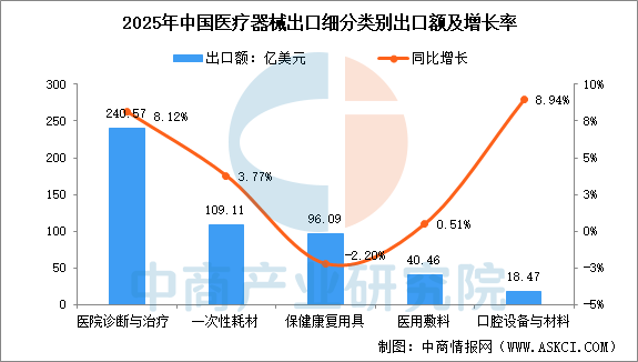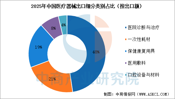从细分产品来看,医院诊断与治疗类产品为出口主力,出口额达240.57亿美元,同比增长8.12%,手术机器人、PET影像设备等高附加值品类呈爆发式增长。一次性耗材出口额达109.11亿美元,同比增长3.77%,品类分化明显,医用导管等增长亮眼,手套品类受关税拖累下滑。保健康复类产品出口96.09亿美元,同比微降2.20%,康复辅具成为增长亮点。医用敷料类出口额40.46亿美元,微增0.51%,高端功能性敷料表现突出。口腔设备与材料类出口额18.47亿美元,同比增8.94%,牙科器具、诊断设备为核心增长动力,产品整体呈现高端化、专业化的发展特征。
