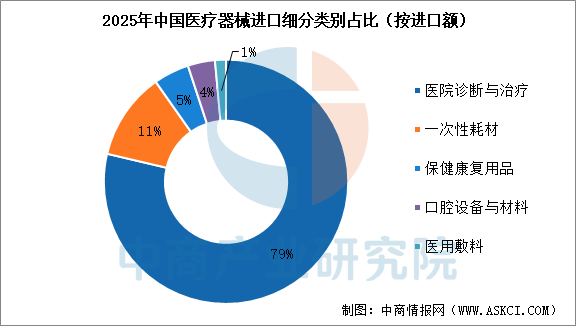 从细分产品来看,医院诊断与治疗类为进口核心品类,占比79%,虽同比微降2.26%,但高端CT、高端B超等技术壁垒较高的品类进口保持增长;一次性耗材类进口小幅增长0.47%,成为唯一正增长品类;保健康复用品、口腔设备与材料类进口降幅显著,同比分别下跌9.59%、12.10%,中高端耗材国产替代成效显现;医用敷料类进口微降2.02%。成熟品类受集采、国产替代影响进口收缩,进口需求进一步向临床必需的高端领域聚焦。