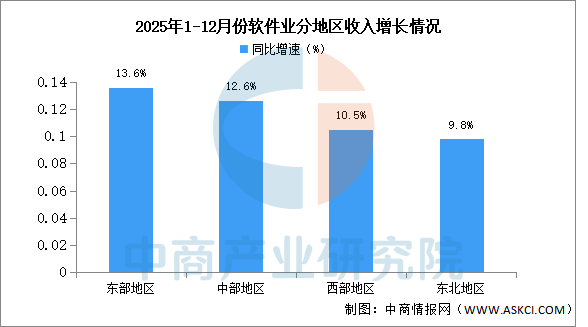2025年,东部地区、中部地区、西部地区和东北地区软件业务收入分别同比增长13.6%、12.6%、10.5%和9.8%。东部地区软件业务收入占全国的83.1%。
