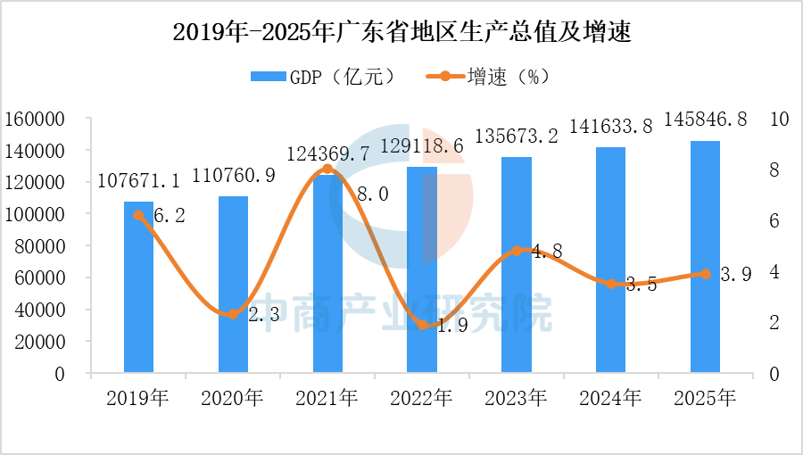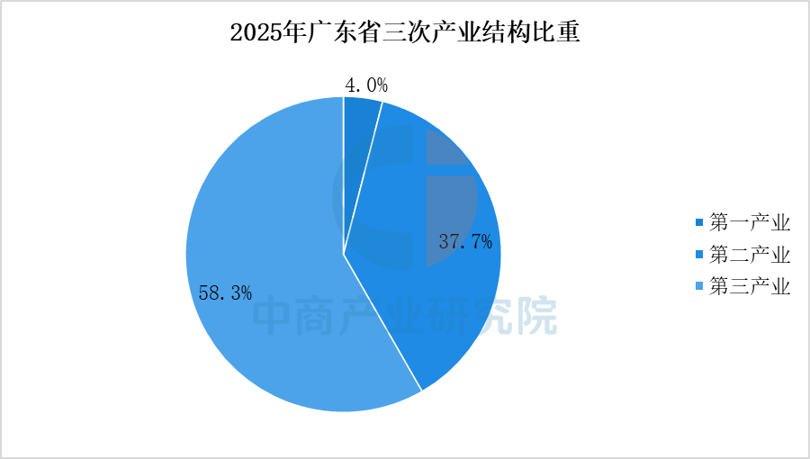 从经济发展情况来看,2025年,广东地区生产总值达145846.8亿元,总量连续37年稳居全国首位,是全国经济稳定发展的重要支撑。2025年第一产业增加值5891.8亿元,增长4.5%;第二产业增加值54993.5亿元,增长2.4%;第三产业增加值84961.5亿元,增长4.7%,三次产业结构为4.0:37.7:58.3。