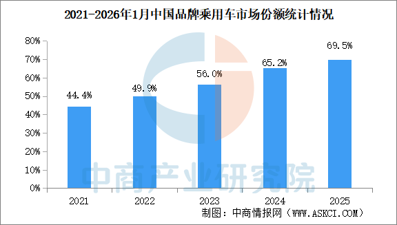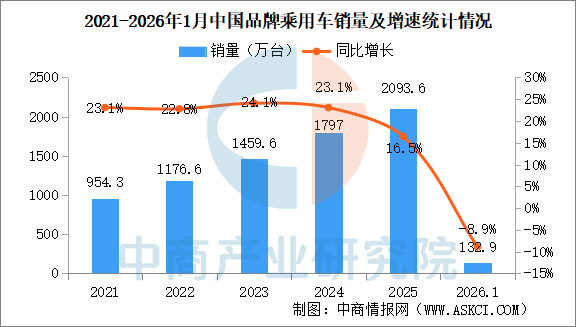 中商情报网讯:2026年1月,中国品牌乘用车共销售132.9万辆,环比下降32.1%,同比下降8.9%,占乘用车销售总量的66.9%,销量占有率比去年同期降低1.5个百分点。