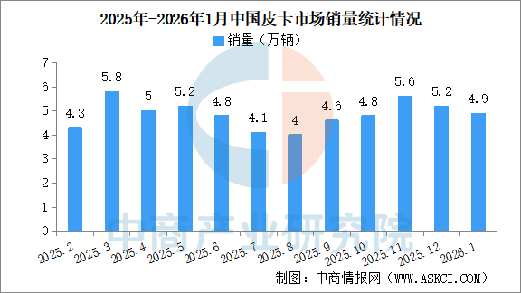 中商情报网讯:皮卡产销呈现强势增长特征,2026年1月份皮卡市场销售4.9万辆,同比增长22.5%,处于近5年的同期高位水平。2026年1月份皮卡生产为5.2万辆,同比增长29.3%。