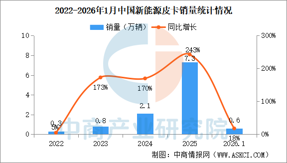 2026年1月新能源皮卡0.6万辆,同比增长18%,环比增长6%;形成超强于皮卡总体增速的较好走势。