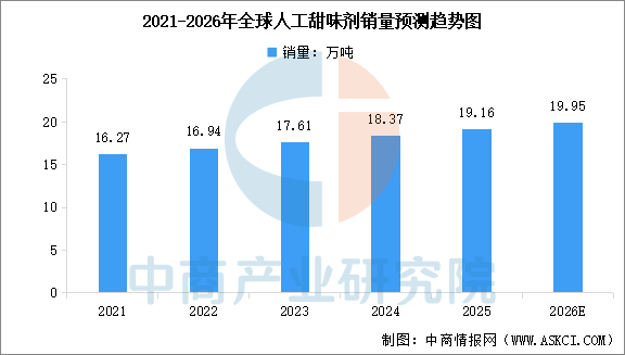 甜味剂为添加到食物中赋予食品甜味的物质。按原材料及制造方式分类,甜味剂可分为人工甜味剂、天然甜味剂以及糖醇类甜味剂。人工甜味剂通常都是高倍甜味剂,其甜度至少是白糖的数十倍。随着食品工业的快速发展,全球人工甜味剂销量保持平稳增长。中商产业研究院发布的《2025-2030年中国食品添加剂行业发展趋势及预测报告》显示,2024年全球人工甜味剂销量达18.37万吨,2025年销量约19.16万吨。中商产业研究院分析师预测,2026年全球人工甜味剂销量将达到19.95万吨。