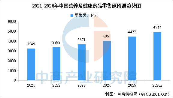 营养及健康食品是指有助于补充营养、优化膳食结构或支持整体健康,并具有特定营养或功能属性的食品,主要包括运动营养食品与功能食品两大类别。中商产业研究院发布的《2025-2030年中国功能性食品市场调研分析及投资前景研究预测报告》显示,中国营养及健康食品零售额从2021年的3249亿元增长至2025年的4477亿元,期内年均复合增长率达8.3%。中商产业研究院分析师预测,2026年中国营养及健康食品零售额将达到4947亿元。