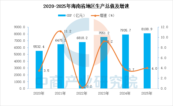 2025年海南省地区生产总值8108.85亿元,按不变价格计算,比上年增长4.0%。其中,第一产业增加值1642.55亿元,增长4.4%;第二产业增加值1463.86亿元,增长1.0%;第三产业增加值5002.44亿元,增长4.6%。三次产业结构调整为20.3:18.0:61.7。