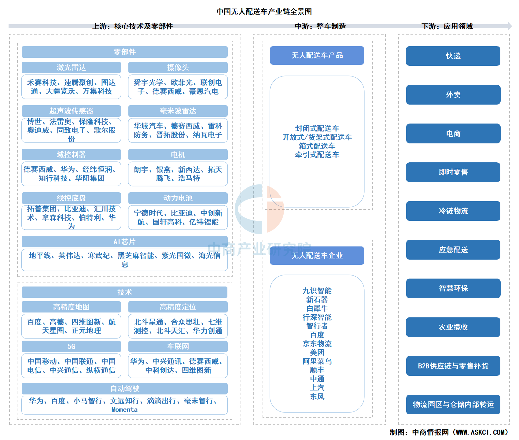 无人配送车产业链较为完善,上游为核心技术及零部件,零部件包括激光雷达、摄像头、超声波传感器、毫米波雷达、域控制器、电机、线控底盘、动力电池、AI芯片;技术包括高精度地图、高精度定位、5G、车联网、自动驾驶;中游为整车制造,无人配送车产品包括封闭式配送车、开放式/货架式配送车、箱式配送车、牵引式配送车;下游应用领域包括快递、外卖、电商、即时零售等。