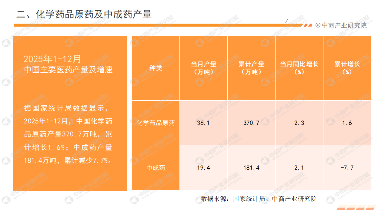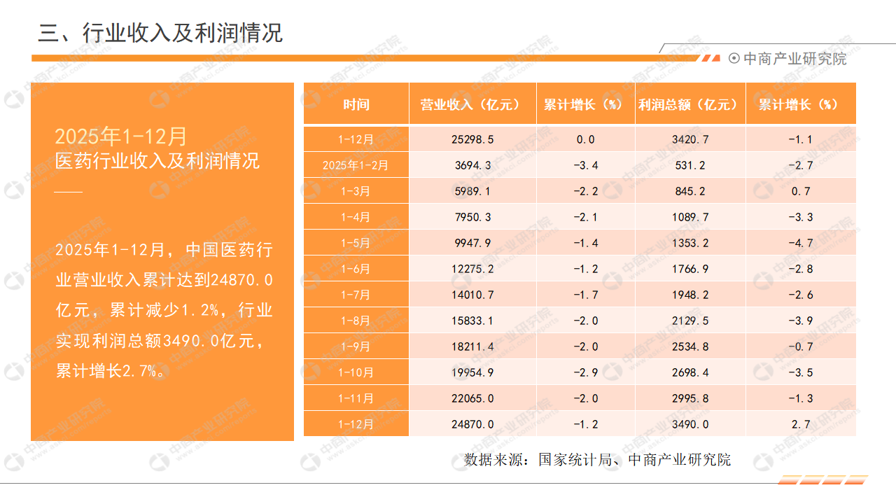 2025年1-12月,中国医药行业营业收入累计达到24870.0亿元,累计减少1.2%,行业实现利润总额3490.0亿元,累计增长2.7%。